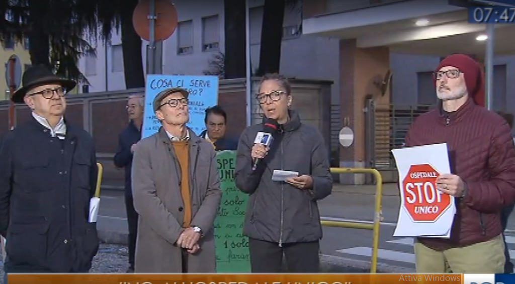 La giornalista del Tg regionale, collegata oggi, 26 ottobre, dall’ingresso del Sant’Antonio Abate per la trasmissione “Bungiorno Regione”, ha raccolto alcune voci critiche rispetto al progetto della nuova struttura a Beata Giuliana, nel Comune di Busto. Con Mason, c’erano Giuliano Troiani (Comitato Stop Ospedale Unico, ha parlato di depauperamento e depotenziamento dei nosocomi esistenti) e Marco Caldiroli (Medicina Democratica) che ha inquadrato la situazione richiamando la necessità «…di un piano sociosanitario basato su obiettivi di salute e non di bilancio, di un riequilibrio di funzioni tra ospedale e medicina territoriale e di un vero Centro unico di prenotazione».