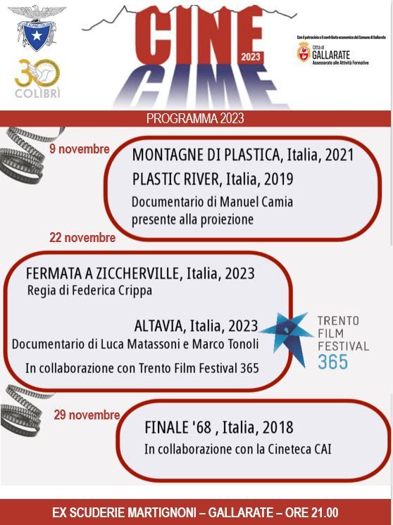 Tre serate, cinque proiezioni per la nuova edizione di “Cine Cime”, il cineforum del Cai Gallarate (locandina in fondo). Si incomincia giovedì 9 novembre con due documentari del film maker, presente in sala, Manuel Camia. "Montagne di plastica" è incentrato sul primo studio mondiale sulla contaminazione da plastica dei ghiacciai. Camia documenta le indagini dell’Università degli Studi di Milano, fra ambienti naturali e laboratorio, per svelare la connessione, spesso inaspettata, tra comportamenti diffusi e luoghi erroneamente considerati intatti. In "Plastic River", invece, il protagonista è un giovane appassionato di kayak che percorre fiumi e laghi della Lombardia, (ri)scoprendone la bellezza e recuperando i rifiuti di plastica in cui si imbatte.