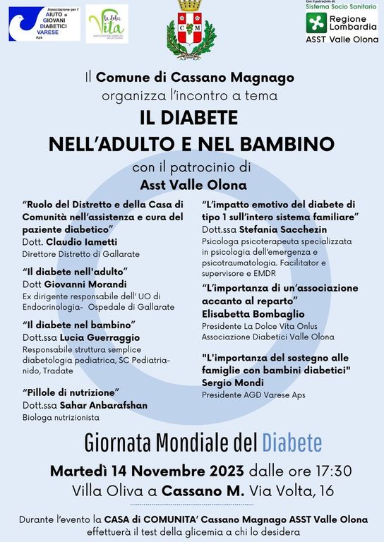 Ecco perché ASST Valle Olona ha patrocinato un incontro a tema “Io diabete nell’adulto e nel bambino” che si terrà in occasione della Giornata Mondiale del Diabete (14 novembre), organizzato dal Comune di Cassano Magnago.