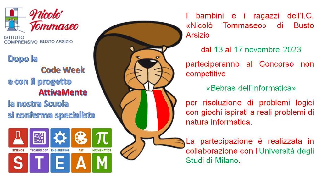 Infatti, i bambini e i ragazzi dell’I.C. «Nicolò Tommaseo» dal 13 al 17 novembre 2023 parteciperanno al Concorso non competitivo «Bebras dell'Informatica» per risoluzione di problemi logici con giochi ispirati a reali problemi di natura informatica. L’attività è realizzata in collaborazione con l’Università degli Studi di Milano.