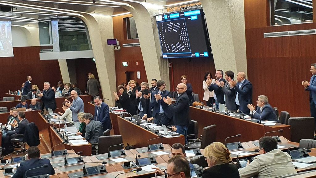 Sguardi increduli tra i banchi della maggioranza, mentre i consiglieri di opposizione scattano in piedi e applaudono l’inatteso assist.