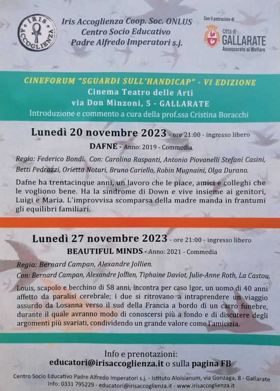 La Cooperativa Sociale Onlus Iris Accoglienza di Gallarate organizza la sesta edizione della rassegna cinematografica “Sguardi sull'handicap”: due appuntamenti aperti alla cittadinanza, al Cinema Teatro delle Arti di Gallarate, in cui verranno proiettate altrettante pellicole sul tema della disabilità (locandina con info in fondo all’articolo).