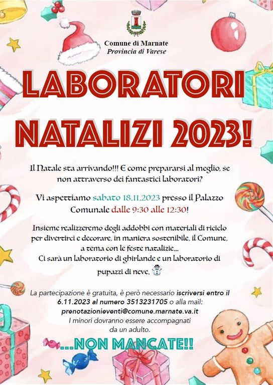 La mattinata di sabato inizierà con i laboratori natalizi che, a partire dalle 9.30, trasformeranno il palazzo comunale in una vera e propria officina di Babbo Natale, dove con materiali di riciclo saranno prodotte ghirlande e pupazzi di neve che saranno poi utilizzati per abbellire il cortile interno del municipio.