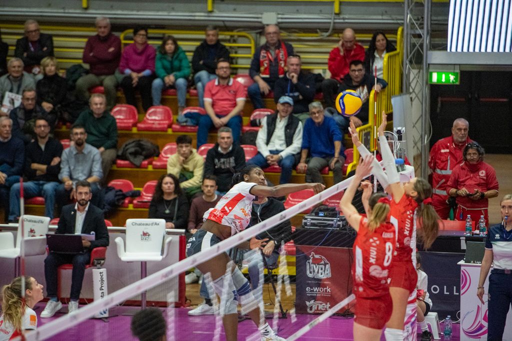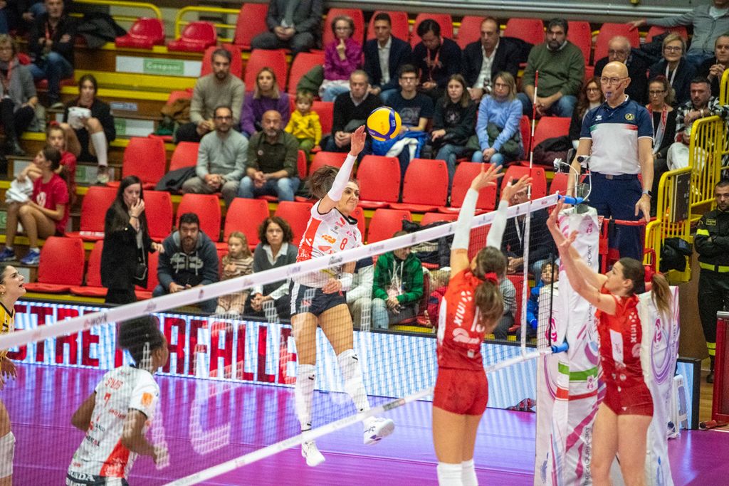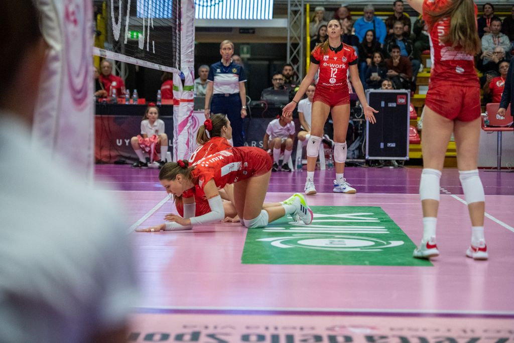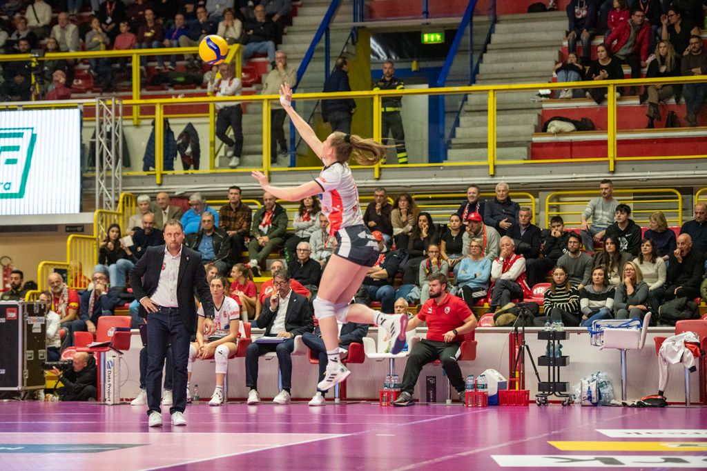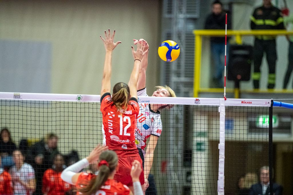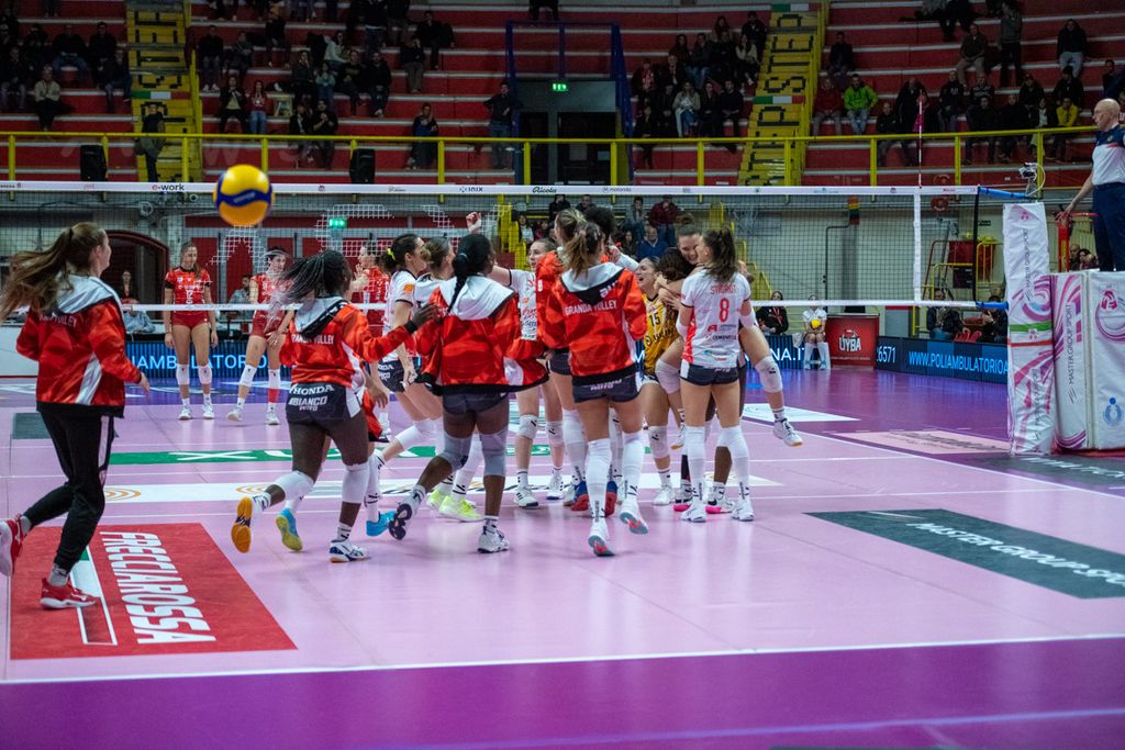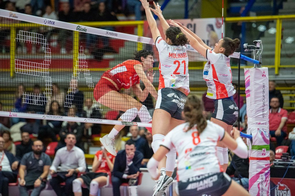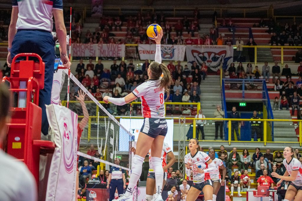 Nel quarto parziale, Cichello inserisce Giuliani per Frosini, con Carletti che si sposta all'opposto. E la mossa paga i dividendi sperati (10-6). Le farfalle allungano (14-9) e mettono un bel divario tra loro e Cuneo. Nel frattempo, Matteo Arnaldi vince il primo singolare nella finale di Davis e porta l'Italia del tennis in una posizione di grande vantaggio (LEGGI QUI). Come la Uyba, che cambia la diagonale (Valkova-Frosini per Boldini-Carletti) per il “giro dietro”), e mantiene un buon gap (16-13) seppur non rassicurante. Il match non vuole proprio saperne di avere un padrone (21-21 con super Adelusi). Adesso è un gioco di nervi. Bracchi, in pipe, fa esplodere l'arena (23-22). Ma si va ai vantaggi. Cuneo spreca sul 26-25 (Adelusi out) e finisce 27-25.