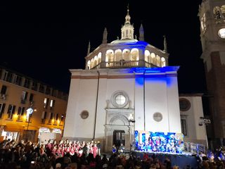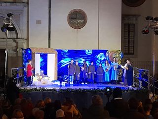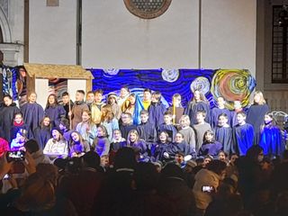 «Mi sembra che sorga il bisogno di una sosta per un pensiero più profondo, anche indipendentemente dalla nostra specifica fede». Riflessione di monsignor Severino Pagani, intervenuto all’ormai tradizionale rappresentazione natalizia della Chicca Gallazzi (foto sotto), sul periodo complesso, a volte smarrente, in cui “cade” il Natale 2023. E, insieme alle insegnanti, i bambini della primaria, dal palco allestito in una scintillante piazza Santa Maria, hanno offerto un momento di profondità e bellezza. Hanno raccontato, con le loro voci e le loro note, l’avvento, nelle parole della coordinatrice Paola Luoni, «…di colui che ha cambiato la storia».