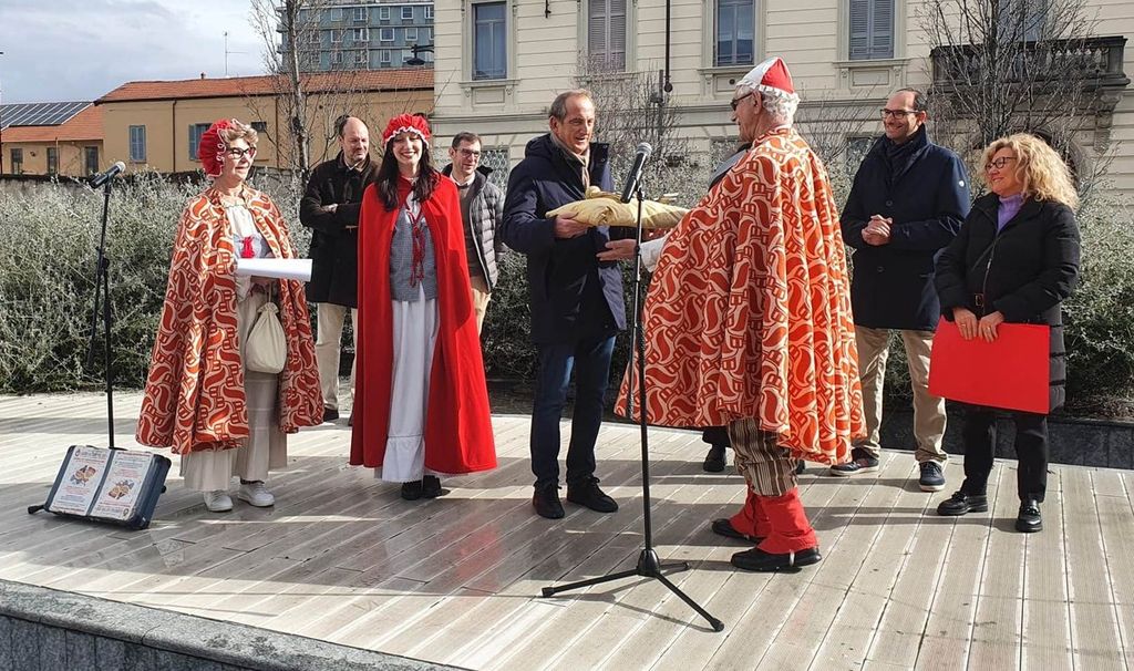 Sul palchetto della piazza anche la Famiglia Sinaghina, associazione di riferimento del Carnevale cittadino, rappresentata dal presidente Simone Colombo e dal past president Rolando Pizzoli. Con loro gli assessori Daniela Cerana e Salvatore Loschiavo.