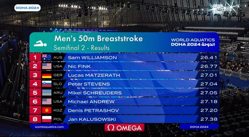 L'azzatese è primissimo nella sua semifinale dei 50 rana alla rassegna iridata di Doha, in Qatar: approda così con il secondo tempo assoluto (26"65 contro il 26"41 dell'australiano Sam Williamson, poi ecco il solito statunitense Fink con 26"77 e il tedesco Matzerath con 27"01) all'ultimo atto di domani previsto alle 18.01.