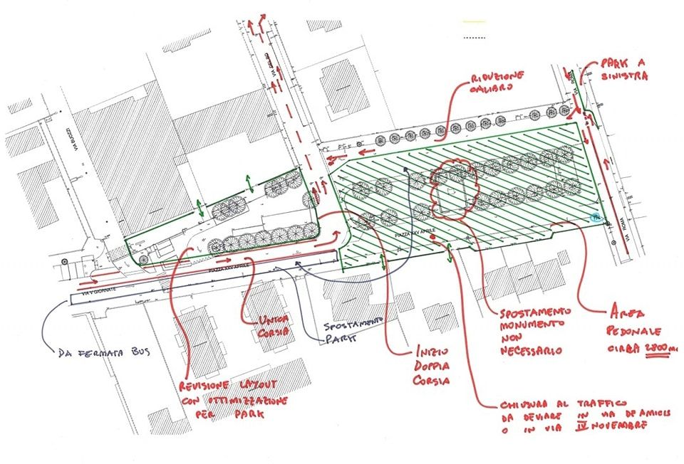 Abbiamo inviato e depositato tramite PEC la nostra proposta all'attenzione dell'amministrazione comunale PRIMA di renderla pubblica per il doveroso rispetto delle istituzioni, cosa che non sempre avviene. Se si vogliono ottenere dei cambiamenti positivi per la città, bisogna avere coraggio e senza alcun timore la nostra proposta può cambiare una parte importante di città e regalare ai cittadini una vera piazza (la prima!) e non una rotatoria solamente abbellita e nulla più.