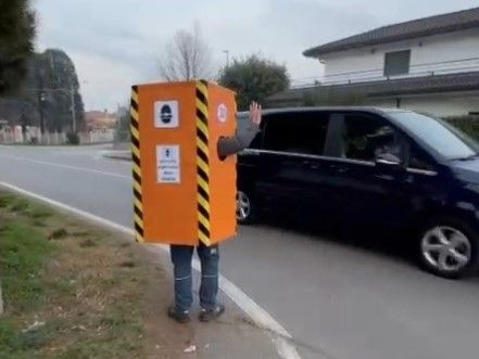 Probabilmente è da queste premesse che è nato lo spettacolo a cui ha potuto assistere nel pomeriggio di ieri, venerdì 16 febbraio, chiunque transitasse in via Pascoli dove per qualche ora è comparso un box veramente fuori dal comune, che passeggiando lungo il lato della carreggiata salutava i guidatori e li invitava alla moderazione.