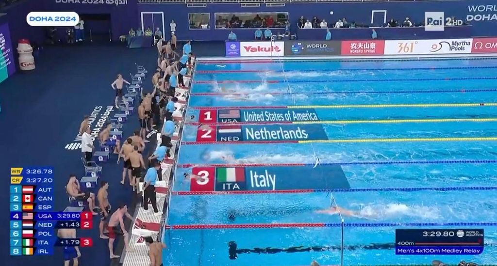 Tris di podi per Nicolò Martinenghi. Nella giornata finale dei Mondiali di Doha la staffetta 4x100 mista sale sul podio (3’31″59) dietro agli imprendibili Stati Uniti (3’29″30) e a un passo dall'Olanda (3’31″23). Per Tete è la terza medaglia dopo le due d'argento nei 50 e 100 rana, per gli azzurri la dodicesima di questa rassegna.