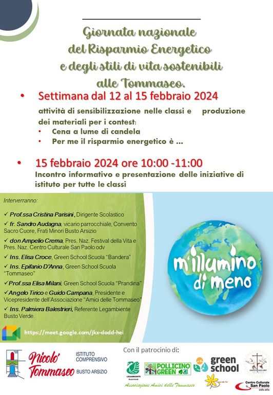Oltre a un attento approfondimento e contestualizzazione sia didattica che extracurriculare nel corso della settimana dal 12 al 15 febbraio, declinato per età e indirizzo di studio, con conseguente istituzione anche di due contest (“Per me il risparmio energetico è …” e “La cena a lume di candela”) è stato organizzato un evento giovedì 15 febbraio.