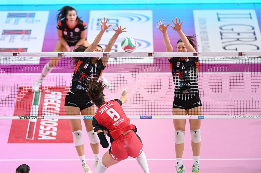 QUARTO SET: sull’onda dell’entusiasmo le cocche mettono il piede sull’acceleratore con l’ace di Pomili (3-7). Affonda Cvetnic in lungolinea ed è doppiaggio (5-10). Inseguono a testa bassa Fiesoli e compagne che si portano a -3 sull’errore di Zanette (9-12). Murone su Stroppa per la nuova fuga biancorossa (10-15). Non vuole mollare la squadra di casa che prova ancora una volta a costruire la rimonta limando a -1 il gap (14-15). Errore in attacco della neo entrata Vittorini e nuovo +5 delle bustocche (16-21). Pomili alza il muro su Stroppa e concede sette set ball alle compagne (17-24). Buona la prima con il muro di Furlan su Broekstra (17-25).