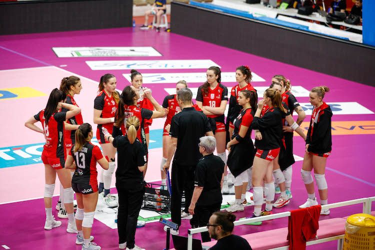 Coach Zanelli, senza Turlà, opta per Taborelli opposta a Balconati, Munarini e la ex Landucci al centro, Piovesan – Rossini in banda con Gamba libero.