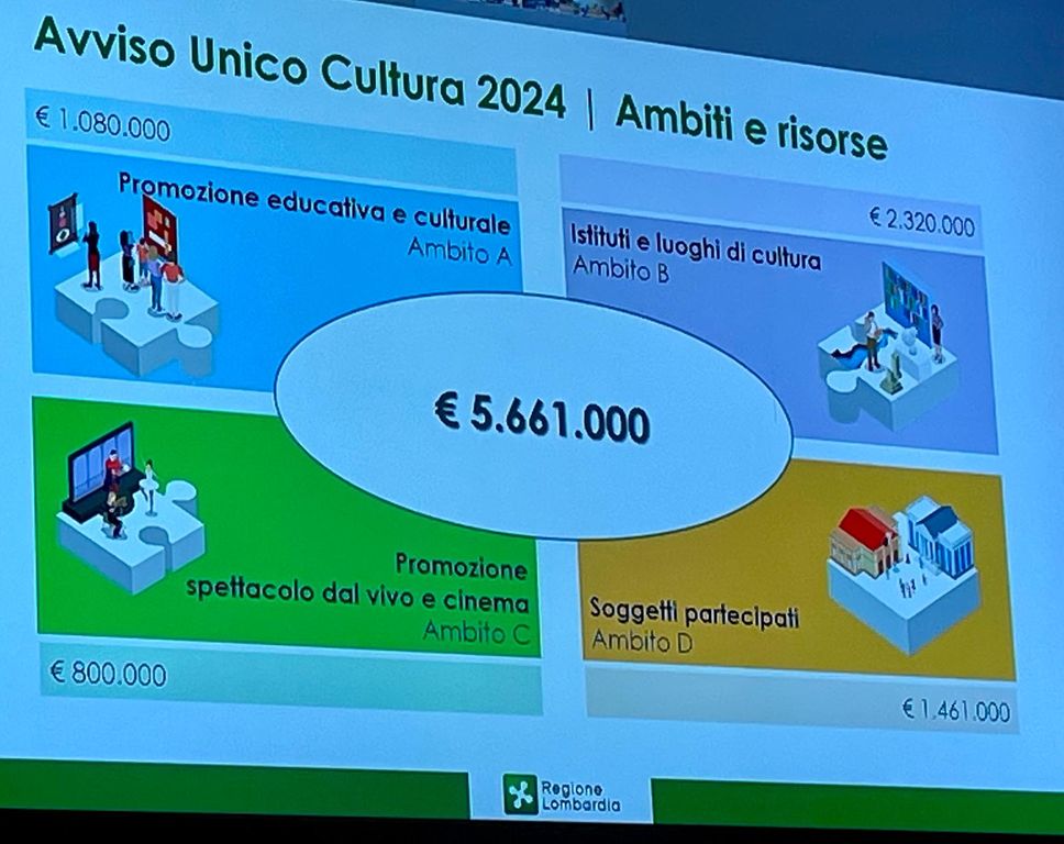 Ammontano a oltre 5.000.000 di euro le risorse stanziate da Regione Lombardia per il bando Avviso Unico Cultura 2024, presentato stamattina a Varese presso gli Uffici Territoriali Regionali.