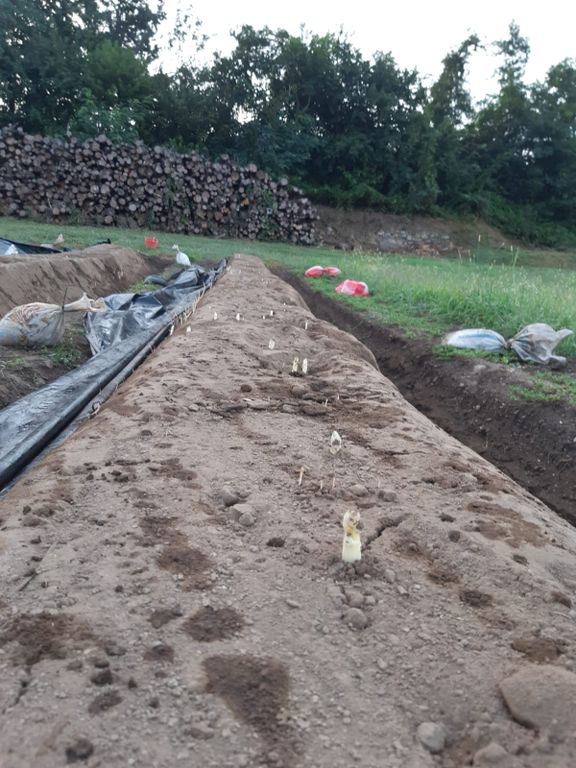 Il "cammino" dell’asparago, dalla terra alla tavola, inizia con la piantumazione: scavato un solco si mette in dimora una radice (detta zampa). La pianta si lasica crescere per un paio di anni, prima di tagliarla di netto quando raggiunge un’altezza tra il metro e mezzo e i due, e prepararla alla produzione vera e propria dell’asparago.