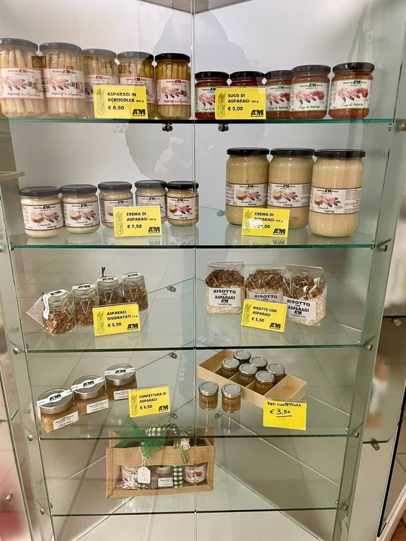 Dal 2009 l’azienda agricola Mazza ha iniziato anche a vendere i trasformati nel proprio punto vendita: asparagi sottolio, asparagi in agrodolce, sugo e crema di asparagi, confettura di asparagi… Ma non solo: per Natale ecco il panettone con l’asparago candito, ed ecco anche il liquore all’asparago con cui vengono riempiti i cioccolatini e i babà.