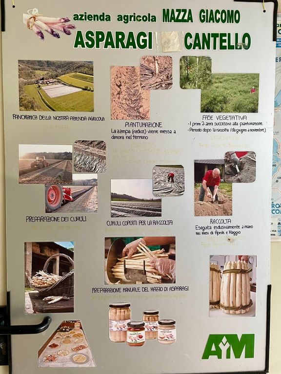 È da poco iniziata la stagione della raccolta: il racconto dell’azienda agricola Mazza Giacomo, uno dei grandi produttori della specialità del paese che attira ogni anno migliaia di turisti dal nord Italia e dal Ticino. Una storia che parte da lontano («L'asparago è stato importato dai nostri avi dalla Francia, ma si sono accorti che qui cresceva meglio») e che guarda al futuro («I giovani? C’è chi si approccia all’agricoltura, però ti deve rendere»). Nel loro punto vendita anche preparati, dolci, liquori e perfino una linea beauty, tutto ovviamente a base di asparago