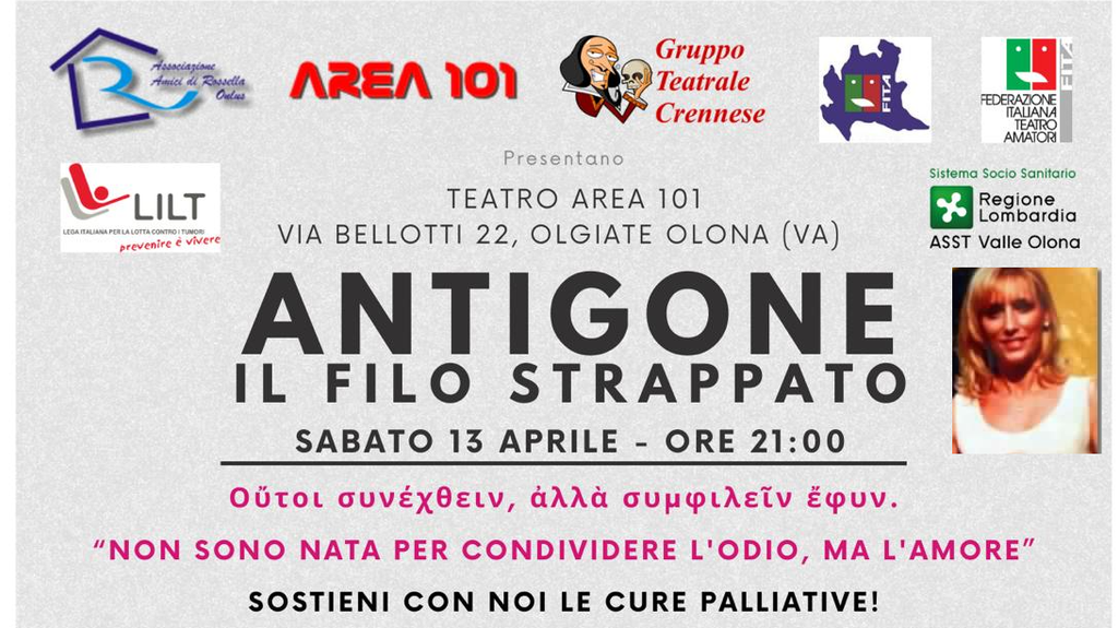 Sabato 13 aprile al teatro Area 101 di Olgiate Olona va in scena una rappresentazione con il Gruppo Teatrale Crennese. "Antigone - il filo strappato", alle ore 21. «Una serata di teatro benefica, desiderata dal personale dell’Unità Complessa di Cure Palliative di Busto Arsizio, in ricordo di tutte le famiglie assistite e a favore della promozione delle Cure Palliative stesse - spiegano i promotori - I fondi saranno devoluti interamente all’Associazione Amici di Rossella Onlus».
