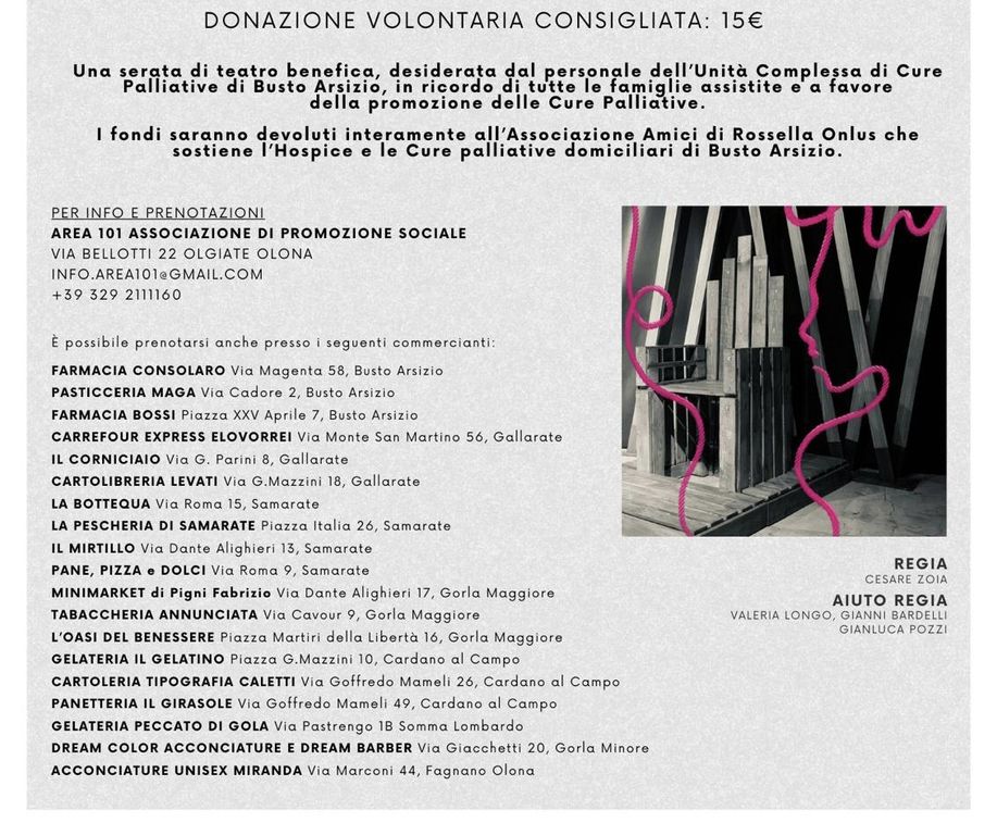 Sulla locandina, racchiusi in un abbraccio, i simboli di Gtc, Area 101, Amici di Rossella, Lilt, spiccano anche i loghi della Federazione Italiana (e lombarda) Teatrale Amatori, Asst Valle Olona.