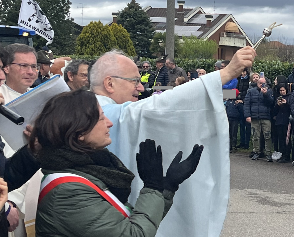 Prima, la messa celebrata sotto il tendone preparato per ogni evenienza. Quindi, monsignor Severino Pagani con il parroco don Gaudenzio Santambrogio e i chierichetti si sono spostati davanti alla chiesetta ad accogliere i trattori, presenti anche la vicesindaco Manuela Maffioli e il consigliere Paolo Geminiani. A tagliare il "traguardo" dei trattori per prima è stata una donna. Il prevosto come tradizione a un certo punto è salito anche su un mezzo e così ha fatto la vicesindaco.