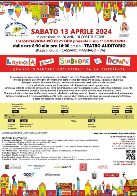 Infine il convegno. Ancora Sara Pietrobon: «Ci è sembrato giusto organizzare una giornata che non fosse solo una presentazione delle nostre attività ma che evidenziasse i diritti. Svilupperemo, con relatori autorevoli, una riflessione e un confronto sull’inclusione sociale e scolastica per persone con Sindrome di Down e, in generale, con disabilità. Parleremo di lavoro, per noi fondamentale, con aziende che hanno assunto nostri ragazzi e che hanno maturato una loro riflessione in merito. Parleremo della diversità fatta dalle unicità, da caratteristiche che possono diventare armonia se riusciamo a sintonizzarci, come avviene con gli strumenti di un’orchestra».