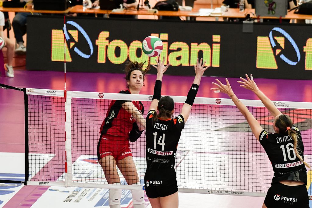 QUINTO SET: primo mini-break delle biancorosse (4-2). Tiene stretto il +2 la squadra di casa sulla palla-out di Fiesoli (7-5). Battaglia interminabile per il punto messo a terra da Zanette che vale il 9-6. Ci credono ancora le ospiti di nuovo a -1 con il muro di Bonelli (9-8). Murone di Furlan - bell'ingresso al posto di capitan Tonello - su Bolzonetti e la Futura si avvicina all’obiettivo (12-9). Lungolinea di Zanette che vale tre match-ball (14-11). Buona la seconda con ancora la numero 9 di casa che scrive la parola fine (15-12).
