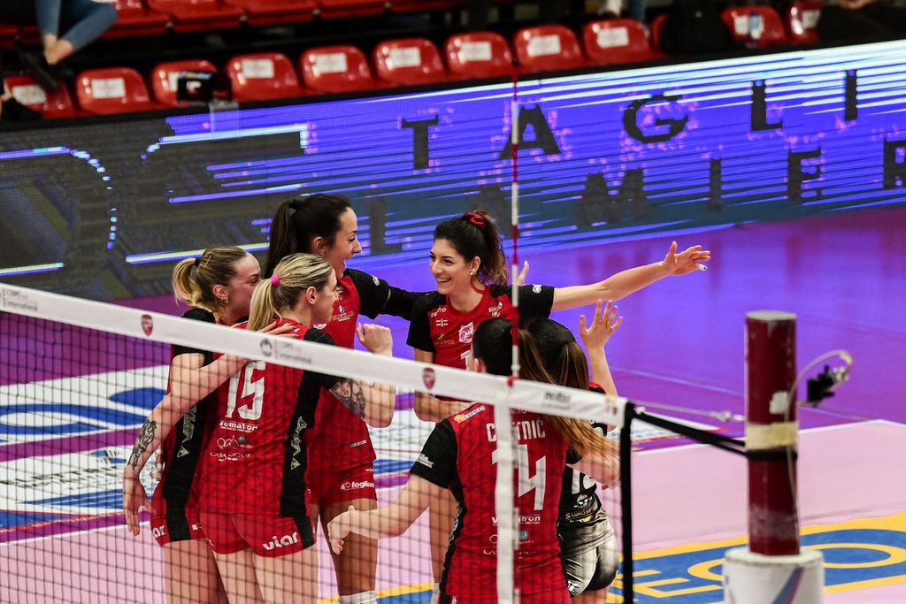 QUARTO SET: sull’onda dell’entusiasmo partono bene le ospiti, avanti 0-3 in avvio. Trova il lungo-linea Dzakovic e piazza l’ace Bolzonetti per il +5 (2-7). Finisce out il pallone attaccato da Cvetnic e il gap inizia a farsi consistente (4-10). Ace di Broekstra su Cvetnic ed è pesante il +8 (4-12). Ingresso in campo ancora per Bosso al posto di Cvetnic. Fast di Mazzon che va a segno e resta a distanza di sicurezza la squadra marchigiana (6-15). Sbatte sul muro l’attacco di Dzakovic e coach Carancini chiama le sue a rapporto (11-18). Alla ripresa la doppietta di una Bolzonetti on fire fissa l’11-20. Nel finale ci pensa il primo tempo di Broekstra a concedere dieci set-ball (14-24). Buona la prima con la palla out di Rebora che vale il tie-break (14-25).