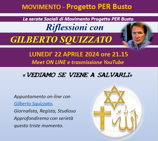 «Busto Arsizio ha in dote alcuni intellettuali di spessore e grande valore. Uno di questi è senza dubbio Gilberto Squizzato – affermano gli organizzatori –. Movimento Per Busto affronta e sostiene tutte quelle pratiche che avvicinano i cittadini alla riflessione sociale e culturale, su tutti gli aspetti legati al Bene Comune. Se siete interessati ad una interpretazione ed analisi della questione israelo-palestinese, da parte di chi è depositario di una grande esperienza culturale e di informazione, non mancate questo incontro».