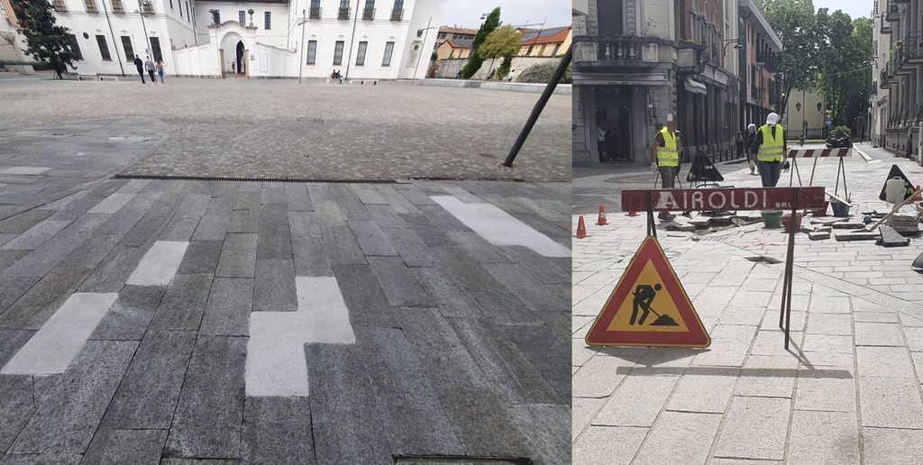 Più delicata la situazione nella piazza su cui si affaccia Palazzo Marliani Cicogna. Qui, in effetti, si sono susseguiti gli interventi di ripristino negli anni, ma il "ballo" delle lastre non è mai stato interrotto in maniera definitiva. Ogni volta che veniva disposta una manutenzione, non trascorreva molto tempo ed ecco che si rovinavano ancora. Si staccavano pezzi ancora, con pericoli per tutti, a partire da pedoni e ciclisti.