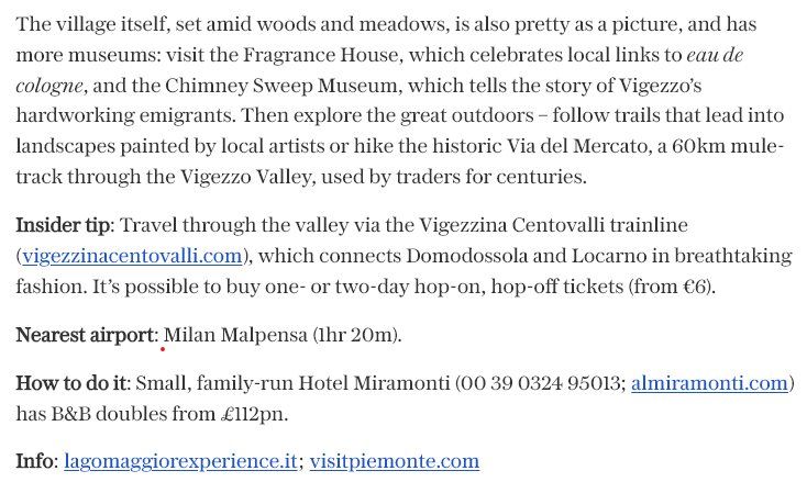 Nel post, a firma di Sarah Baxter pubblicato il 13 maggio, Santa Maria Maggiore viene presentata come un pittoresco paesino che merita già di per sé una visita, ma viene in particolare posto l'accento sulla ricchezza della sua storia e dei suoi musei, da quello degli Spazzacamini alla Casa Museo dedicata all'acqua di Colonia.