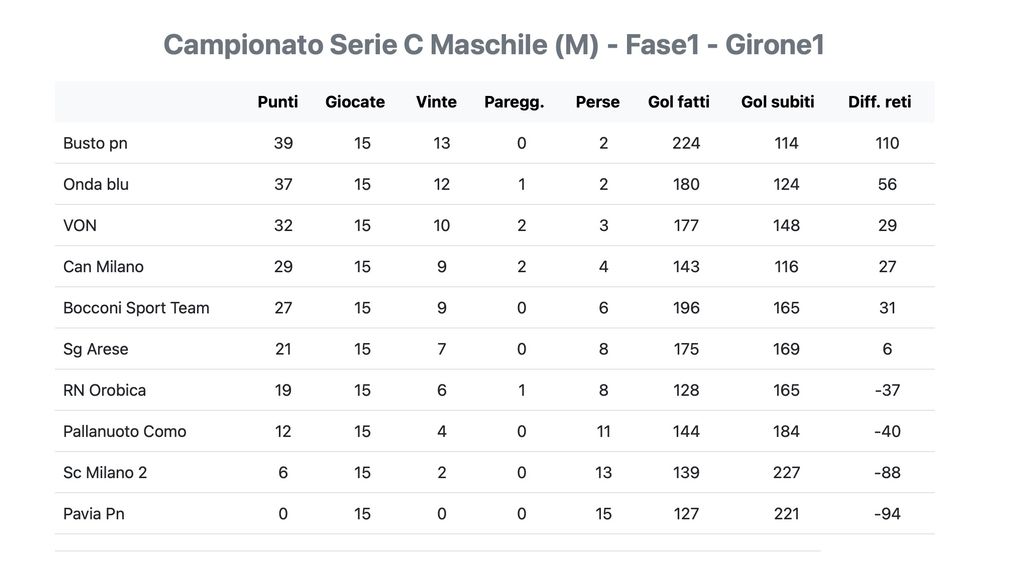 Dopo la sconfitta con Onda Blu settimana scorsa (LEGGI QUI), Busto Pallanuoto Paglini Store è sempre prima in classifica (vedi foto in fondo): 39 punti, 2 in più rispetto proprio ad Onda Blu. Ma è fondamentale la partita contro la Canottieri sabato 18 maggio in casa per ritagliarsi una maggiore tranquillità.
