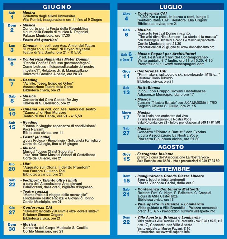 Anche quest’anno l’amministrazione castellanzese, con la collaborazione di numerose associazioni e realtà culturali del territorio, ha realizzato il programma di eventi “L’estate in città”: più di cinquanta appuntamenti che animeranno Castellanza nei mesi di giugno, luglio, agosto e settembre.