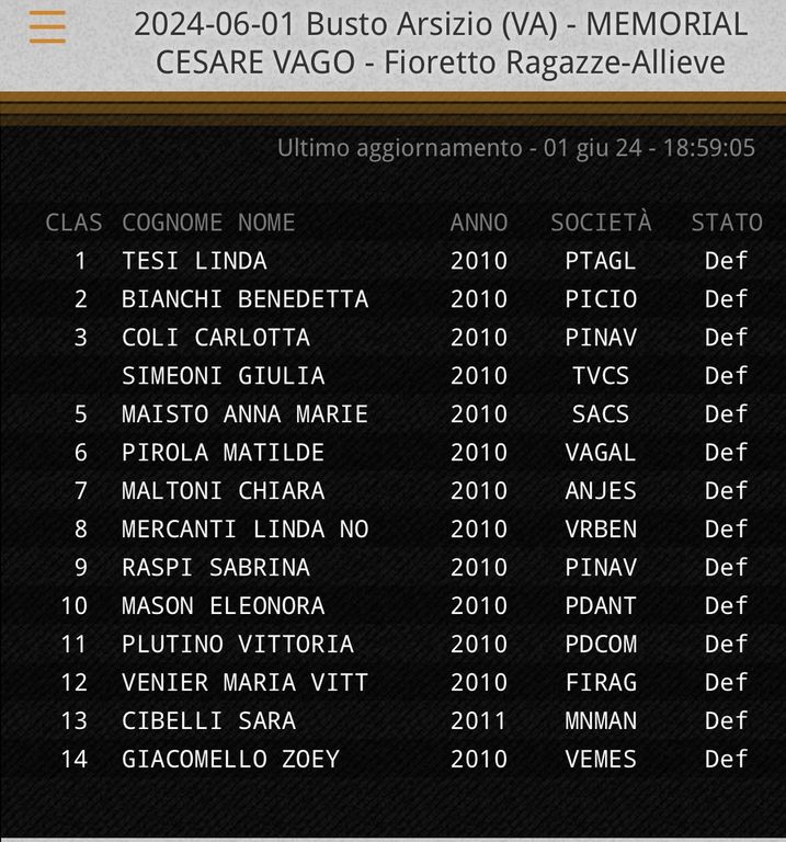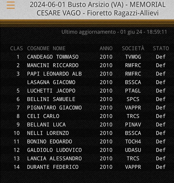 I migliori fiorettisti d'Italia in una gara appassionante a Busto Arsizio per omaggiare Cesare Vago. Il ricordo del presidentissimo della Pro Patria Scherma è stato il carburante di una manifestazione che ha mostrato oggi i frutti dell'impegno incessante di Cesare, scomparso l'anno scorso (LEGGI QUI): la squadra incredibile che è questa società a tutto campo. Non solo cioè gli atleti e i maestri, ma l'intero staff: se c'è stata un'assistenza al top, è avvenuto anche per i familiari degli sportivi che hanno svolto con la consueta dedizione il lavoro per la perfetta riuscita della "prima" di questa manifestazione.