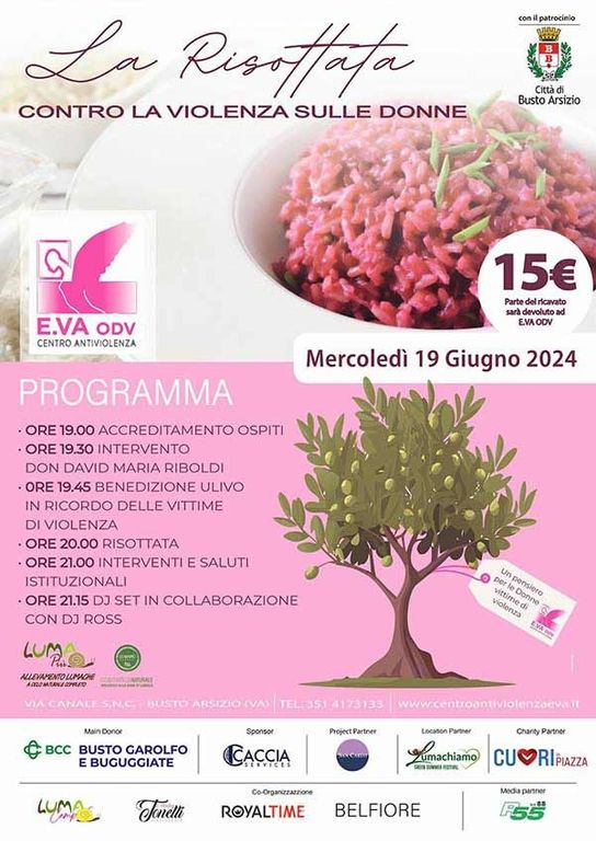 La risottata, proposta a 15 euro, con parte del ricavato a favore del Centro Antiviolenza E.VA Odv, prevede una gratuità per tutti i bambini partecipanti (per una porzione di risotto). L'evento si concluderà con un coinvolgente Dj set in collaborazione con Dj Ross.
