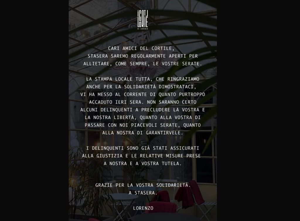 Dopo l'aggressione di sabato notte "Il Cortile di Lorenzo" domenica sera ha voluto dare un segnale e ha aperto regolarmente: «Allieteremo come sempre le vostre serate, grazie a tutti per la solidarietà»