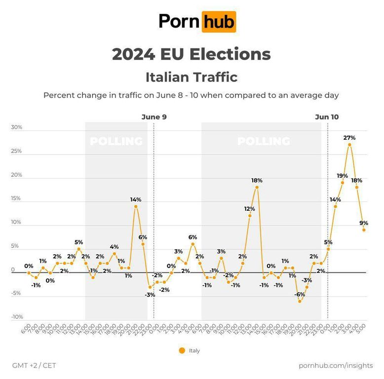 Dopo il voto, tutti a letto. Ma mica a dormire. Nel weekend delle elezioni europee gli italiani si sono lasciati andare. Almeno stando ai dati che ha diffuso il sito a luci rosse Pornhub e in possesso da Adnkronos: ci sono stati picchi di crescita di contatti del 14% e del 18% nelle giornate di sabato e domenica. Ma non solo: lunedì notte gli italiani sono passati dallo spoglio allo spogliarsi e infatti il sito hard ha fatto registrare un clamoroso +27% proprio alle 3, a partita ormai chiusa. È il quadro delineato dalla stessa piattaforma del porno per raccontare le elezioni europee vissute fuori dalle urne.