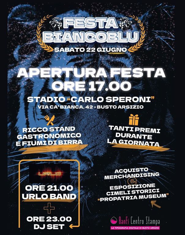 Sabato 22 giugno, a partire dalle ore 17, è in programma allo stadio Speroni la Festa Biancoblu. Organizzano i tre gruppo presenti in Curva: Ultras Pro Patria, Mille Novecento Diciannove e United 88.