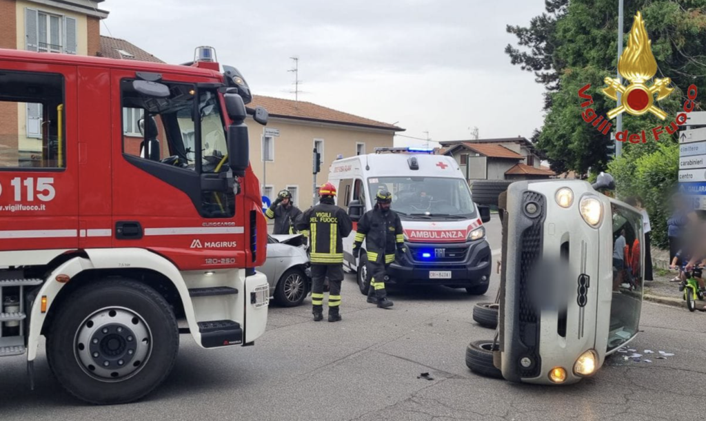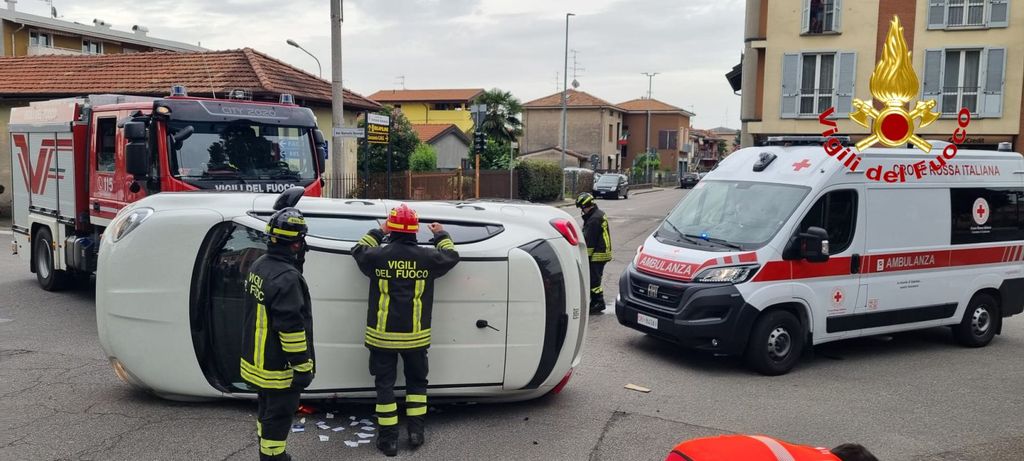 FOTO. Auto si ribalta dopo lo scontro all'incrocio: un ferito a Cassano Magnago