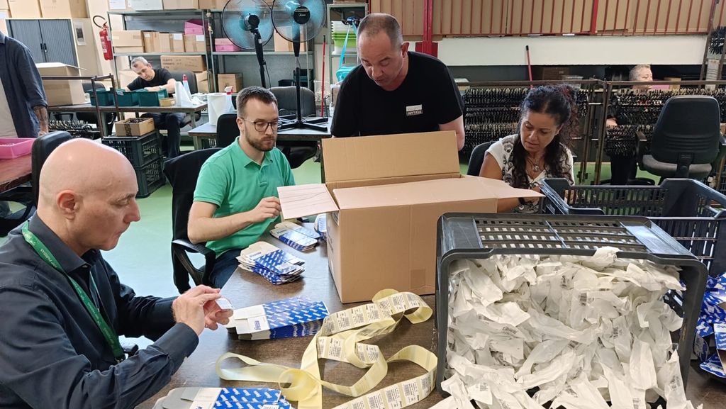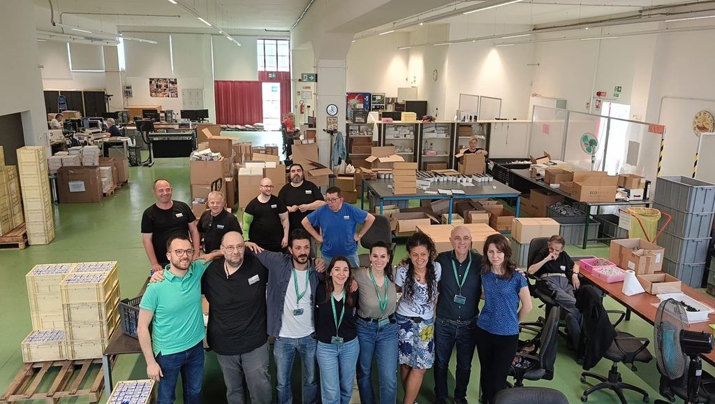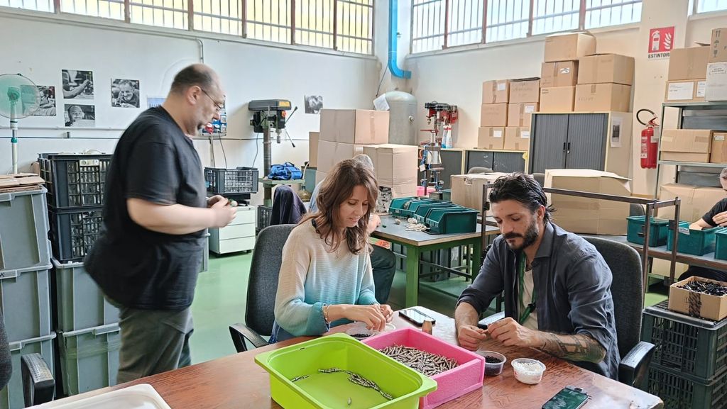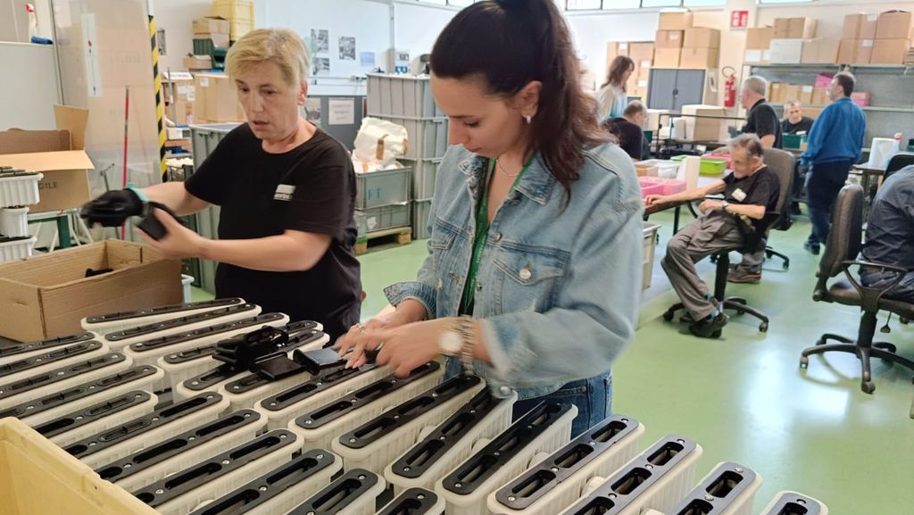 Operativamente si sono sistemati – dipendenti BNP Paribas e dipendenti Solidarietà e Servizi – in quattro tavoli per realizzare assemblaggi: guarnizioni, valvole di motori, componenti idraulici… Dopo un iniziale briefing – ad opera degli stessi lavoratori – tutti all’opera fianco a fianco.  Insieme hanno vissuto anche il rito della pausa, con la campana suonata da Egidio, puntuale come ogni giorno alle 15:30.