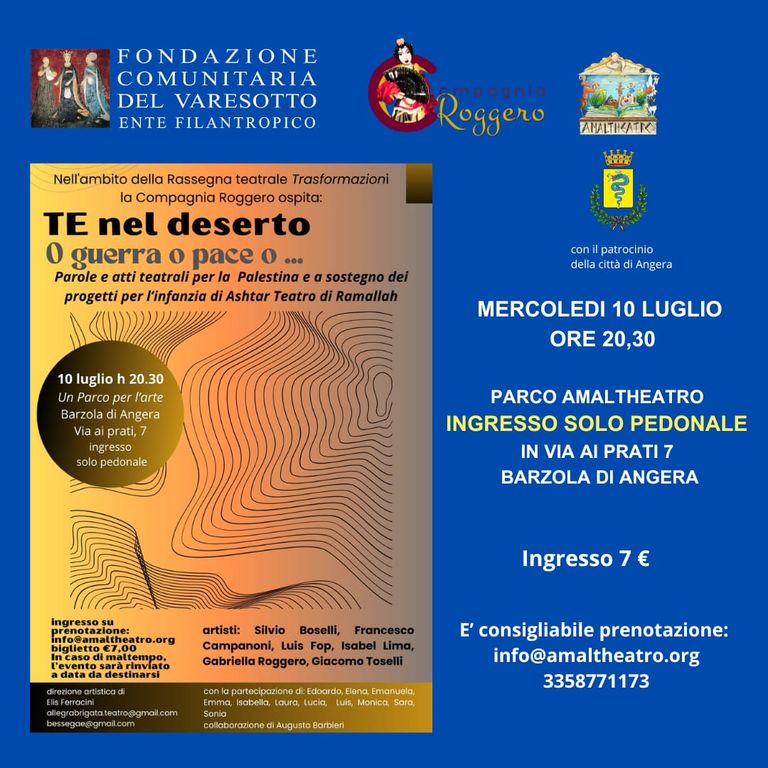 “TE nel deserto” debutta ufficialmente a Barzola di Angera il 10 luglio, alle 20:30, ospite della Compagnia Roggero e di Un Parco per l’Arte, nell’ambito della rassegna teatrale Trasformazioni (locandina in fondo, con info per prenotazioni).