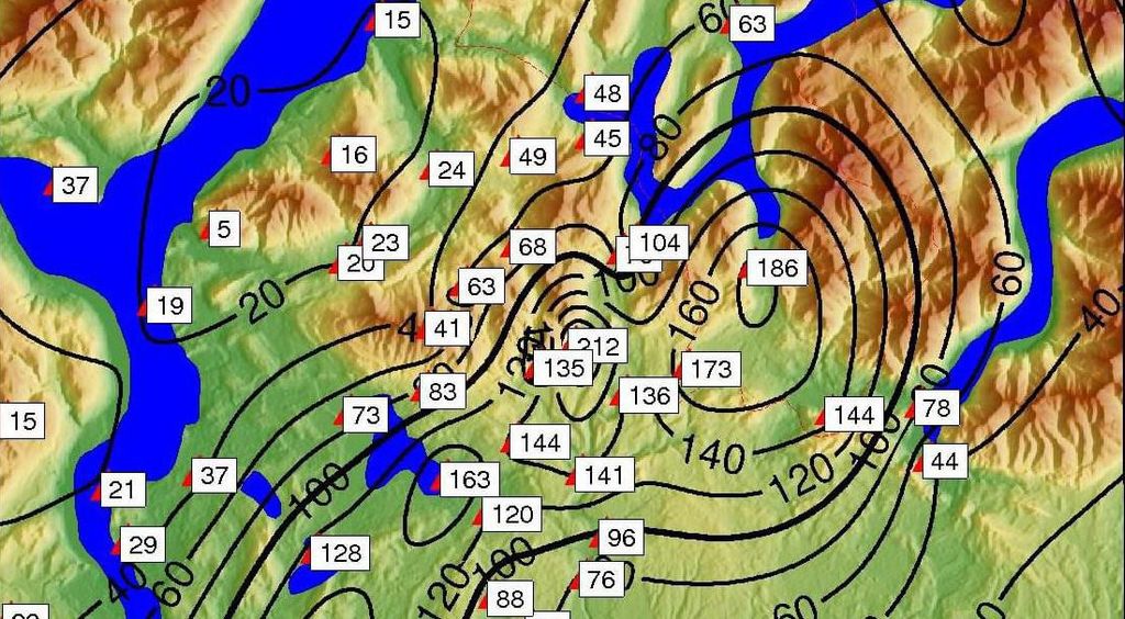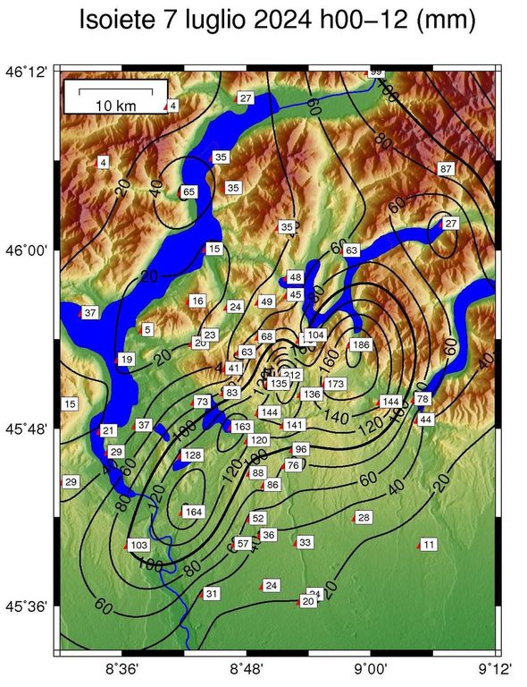 Tra le piogge più abbondanti, le stazioni del centro Geofisico Prealpino hanno registrato, tra mezzanotte e le 12 del 7 luglio, i 212 millimetri di Arcisate, ma notevoli sono stati anche gli accumuli di Varano Borghi (128 mm), Varese centro (155 mm), Schiranna (163 mm), Varese Ipermercato (141 mm). Un quadro completo è fornito dalla mappa delle isoiete, ottenuta con i dati delle stazioni del CGP, ARPA Lombardia, ARPA Piemonte e Meteosvizzera.