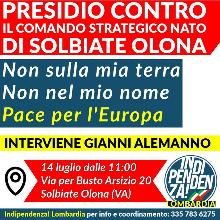 Domenica prossima 14 luglio il Movimento Indipendenza! ha organizzato una manifestazione di protesta contro il Comando strategico Nato di Solbiate Olona (VA). Il presidio comincerà alle ore 11 davanti alla Base NATO di Solbiate Olona (via di Busto Arsizio, 20). Locandina in fondo.