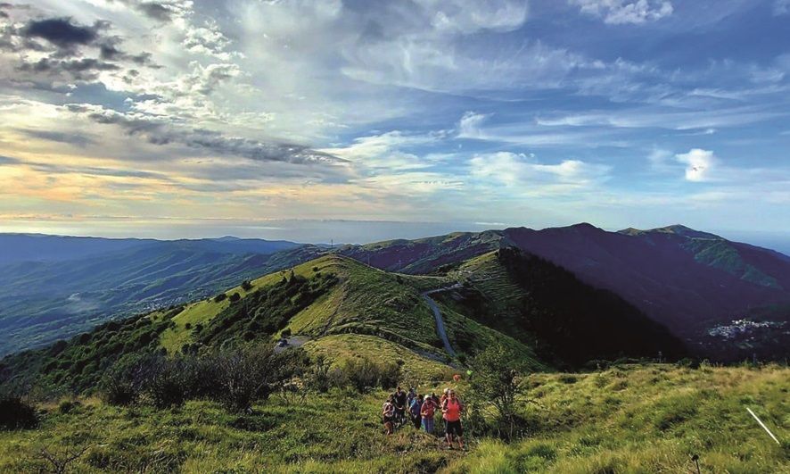 Sul monte Frontè e devo ammettere che salendo sono rimasta particolarmente colpita dal paesaggio, così diverso dal recente passato. Normalmente ad agosto, il terreno era secco con pietre a vista; quest’anno, a fine giugno, invece mi ha stupito l’ambiente ricco di verde e con un soffice tappeto per alleviare i talloni. Una bellissima sorpresa per me! Poi una serie di saliscendi per arrivare quasi in vetta al monte Saccarello dove, al rifugio La Terza, facciamo un “pit stop" veloce. Con le borracce belle cariche, continua la sfida: prima al passo Tanarello, a seguire il Monte Missun e il Monte Bertrand. La vista è mozzafiato, il cielo è azzurro e l’aria fresca di montagna rigenera le gambe e il cuore; le Alpi Liguri sanno regalare un paesaggio unico “a due passi” da casa. In basso a centro valle, sulla strada militare, le moto percorrono l’antica Monesi-Limone e noi quassù sogniamo ad occhi aperti. In serata arriviamo al Rifugio Don Barbera, dove ci aspettano nuove emozioni.