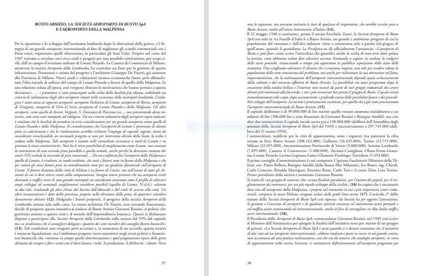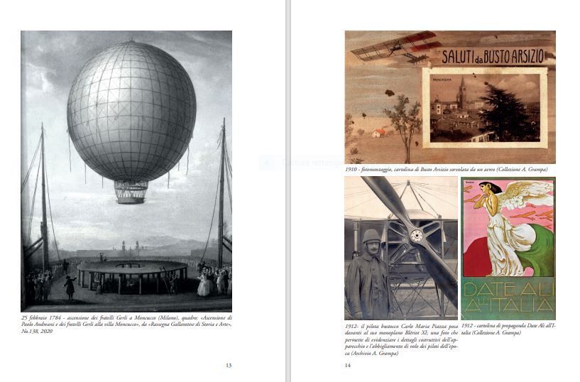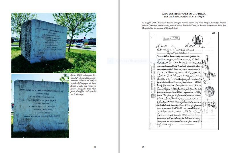 Dopo un articolo introduttivo, si passano in rassegna fatti, personaggi e curiosità sulla storia aviatoria di Busto Arsizio. Eloquente il titolo del capitolo: “Anca a Busti sa vula… Anche a Busto si vola”. Il secondo capitolo è dedicato a Cascina Malpensa, da vecchia cascina lombarda a culla dell’aviazione italiana. Spazio poi alla Società aeroportuale di Busto Spa, all’atto costitutivo e allo statuto della società.