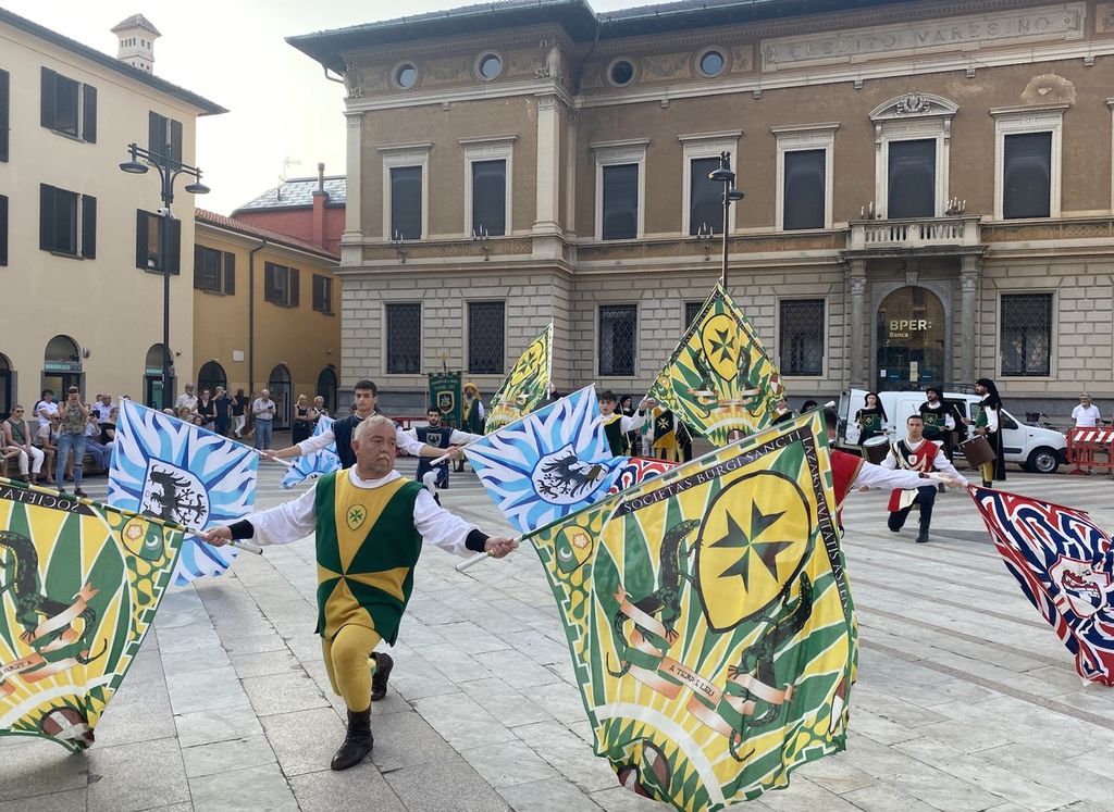 Gli sbandieratori - al suono dei tamburi e delle chiarine - si sono esibiti in diversi numeri, lanciando le loro bandiere e incantando i presenti. Coreografie di gruppo, singole e di coppia hanno permesso di ammirare la destrezza e l’abilità di questo team (annoverato tra i Migliori 10 d’Italia). Gli artisti hanno saputo coordinarsi alla perfezione, creando giochi di colori con le bandiere e facendo sì che il pubblico trattenesse il fiato ad ogni lancio.