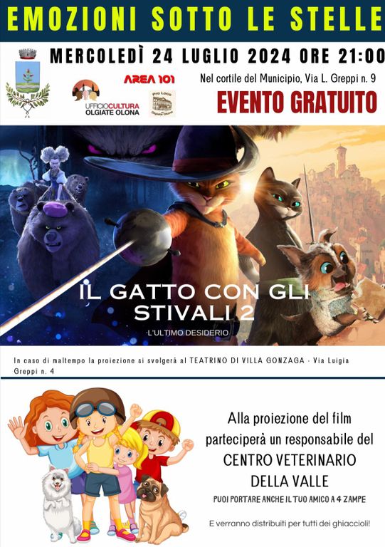 Vi sarà dunque la proiezione del film "Il gatto con gli stivali 2 - L'ultimo desiderio". Quando? Stasera, mercoledì 24 luglio, alle ore 21.15 nel cortile del Comune in via Greppi a Olgiate Olona.