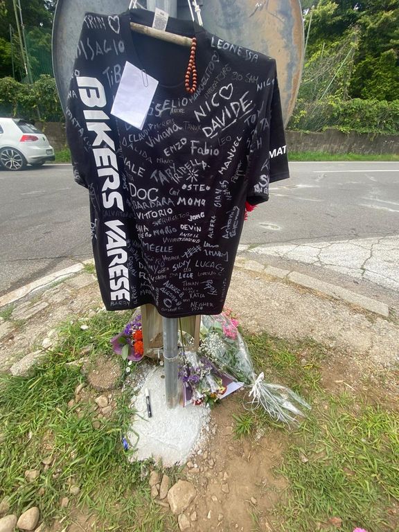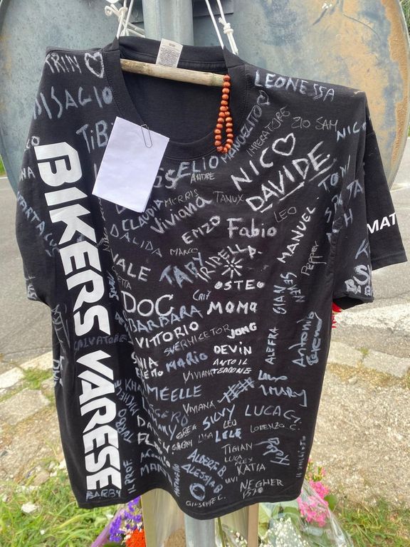 La maglietta con le firme dei Bikers Varese, il messaggio della compagna e della figlia di Mattia e il cappellino con il modellino blu della moto all'incrocio tra via Matteotti e via Toce, il luogo dove ieri il trentaquattrenne varesino ieri ha perso la vita