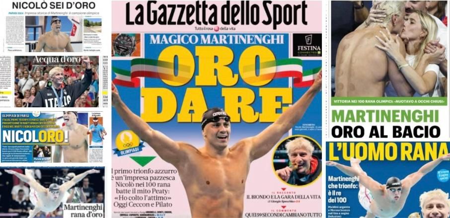 Sul Corriere della Sera Aldo Cazzullo e Adriana Ravelli, ma anche il nostro varesino "FlaviOlimpico Vanetti", Imarisio e Piccardi ci raccontano da Parigi "Martinenghi una rana tutta d'oro", La Stampa dedica la foto centrale della prima pagina a Nicolò sotto il titolo "Acqua d'oro" mentre, tornando ai quotidiani sportivi, Tuttosport spara "Nicoloro": «Tete dai capelli patinati, nella storia 24 anni dopo Fioravanti: brucia per 2/100 Peaty e Fink - scrive il quotidiano torinese - "Ho chiuso gli occhi mentre nuotavo... Che regalo di compleanno"».