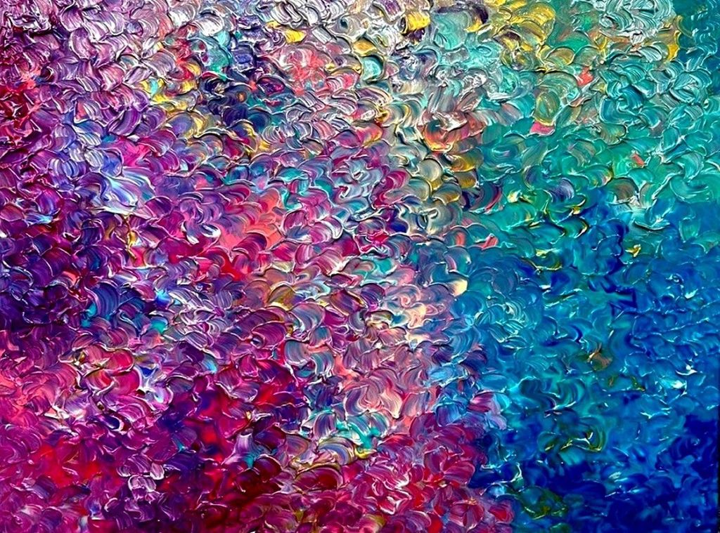 «Le infinite sfumature di Sentimento oceanico (opera significativa dell’artista, che sarà analizzata il 30 Agosto) rappresentano allora, da un lato, la preziosità del singolo, per sua natura unica e irripetibile, e dall’altro, la celebrazione dell’unione dei popoli, considerando che tali picchiettature di materia cromatica potrebbero essere le singole nazioni, gli abitanti di questa Terra - distinti eppure fusi tra loro, in virtù di una convivenza pacifica - o ancora, potrebbero rappresentare coriandoli variopinti, frammenti di stati d’animo, emozioni, ricordi eterogenei a partire dai quali approdare alla consapevolezza di sé con il mondo e con l’altro».