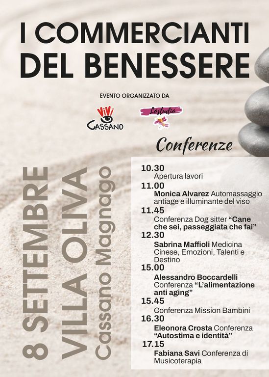 Per tutta la giornata di domenica 8 settembre 2024, nella suggestiva cornice di Villa Oliva a Cassano Magnago, si terrà l’evento “I Commercianti del Benessere 5^ edz.”, patrocinato dal Comune, realizzato dalle attività che in città si occupano del benessere delle persone. Grazie all’intraprendenza della dottoressa Sabrina Maffioli, operatrice olistica con ventennale esperienza nella pratica di Medicina Cinese e Fitoterapia, titolare de Lostudio sono state coinvolte numerose realtà del territorio varesino e l’associazione “Vivi Cassano” composta dai titolari di alcuni negozi di vicinato, che proporranno al pubblico attività, conferenze e laboratori didattici per rispondere alle tante curiosità dei cittadini in merito a discipline ancora poco conosciute e venire incontro alle più diverse esigenze nel campo del benessere.